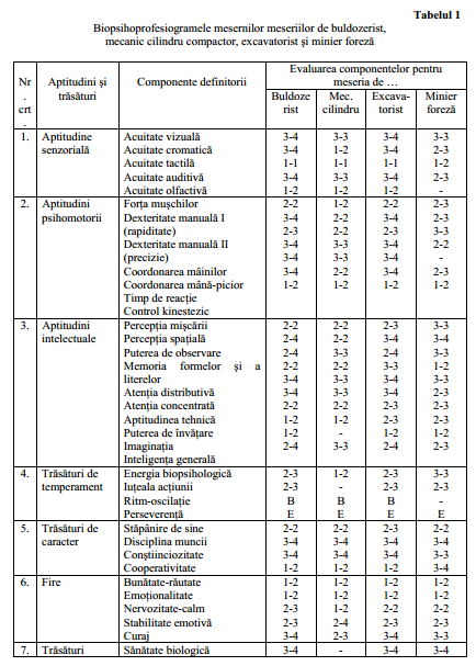 Se efectuează cu răngile, prin ridicare şi împingere, până la locul stabilit. Operaţia se repetă de 4-5 ori în cursu1 unui schimb de lucru. Observaţiile şi investigaţiile întreprinse în teren au evidenţiat faptul că activităţile auxiliare de alimentare cu ulei şi de realizare a legăturilor la motocompresor şi la grupul electrogen au presupus un efort fizic moderat (10,4-19,2 KJ/min), în timp ce montarea ţevilor prelungitoare a necesitat un efort fizic evident mai mare (13,8-25,9 KJ/min), cu componente statice, înfiletarea şi desfiletarea necesitând mişcări rapide cu braţele şi mâinile pentru manipularea patentului. În continuare, aducerea forezei la poziţia de lucru prezintă importante componente statice, implicând musculatura întregului corp (braţe, trunchi, membre inferioare), efortul fizic menţinându-se încă la valori mari (17,6-25,5 KJ/min). Pentru a evidenţia solicitările psihoprofesionale, pe lângă observaţiile şi discuţiile directe cu mecanicii s-au urmărit performanţele fiecărui subiect, în parte, 1a aparatul MRK pentru timpul de latenţă al răspunsurilor, la fuziometru, pentru acuitate vizuală, la dinamometru pentru forţa musculară şi numeroase teste creion-hârtie, cum ar fi: DM pentru dexteritate manuală, TA pentru iuţeala acţiunii etc. Funcţie de rezultatele înregistrate, s-au întocmit biopsihoprofesiograme (tabelul 1) pentru fiecare meserie în parte (buldozerist, mecanic cilindru compactor, excavatorist şi minier foreză). Conform precizărilor din psihologia muncii, biopsihoprofesiograma reprezintă instrumentul de 1ucru care stabileşte matematic nivelul şi ponderea aptitudinilor şi trăsăturilor pe care trebuie să le posede individul pentru practicarea unei anumite meserii. Ea se prezintă sub formă de tabel, în care caz atitudini1e şi trăsăturile specifice unei activităţi productive, definită prin componentele sale, sunt evaluate în cifre. Evaluarea fiecărei componente se face printr-un grup de două cifre: prima cifră reprezintă coeficientul de pondere, respectiv procentul din durata zilei de lucru în care componenta este solicitată, iar a doua cifră reprezintă quartierul, adică nivelul necesar de dezvoltare al aptitudinilor sau trăsăturilor solicitate de meseria analizată.