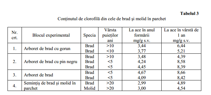 Aşa cum rezultă din cercetările întreprinse de noi (tab. 2), cel mai mare conţinut de clorofilă se găseşte în acele puieţilor crescuţi sub masivul încheiat: 4,67 mg/g substanţă verde la acele din creşterea curentă (în anul formării) şi 8,86 mg/g substanţă verde la acele din creşterea anului precedent (în vârstă de un an). Valorile cele mai mici s-au constatat la puieţii dintr-un ochi de brădet (3,19 mg/g substanţă verde la ace din creşterea curentà) şi la puieţii din arboretul de brad cu gorun la acele în vârstă de un an (6,44 mg/g substanţă verde). Rezultă deci că acest indicator al conţinutului de clorofilă are în general, o dependentă inversă faţă de intensitatea luminii.