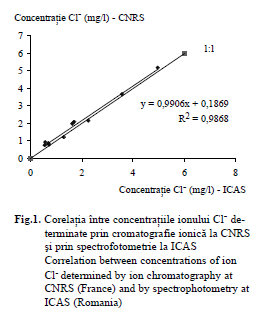 Rezultatele obţinute la determinarea conţinutului în ioni Cl– prin spectrofotome- trie în laboratorul ICAS sunt comparabile cu cele obţinute prin cromatografie ionică la CNRS, deşi se costată o uşoară subestimare a valorilor în labratorul ICAS.