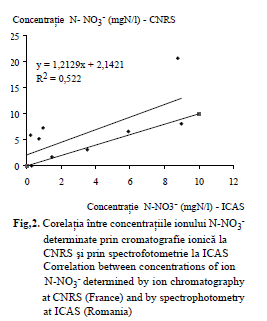 În laboratorul ICAS Câmpulung s-a pus în evidenţă tendinţa de creştere în timp a concentraţiei ionului NO3– pentru 64 % din cele 226 probe reale de precipitaţii reana- lizate la intervale de 3-90 zile de la recoltare (Barbu et al., 1999). Această tendinţă s-a constatat şi în prezentul exerciţiu de inter- calibrare, după cum reiese din ecuaţia dreptei de corelaţie şi din poziţia ei faţă de dreapta 1:1 (fig. 2).