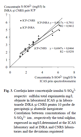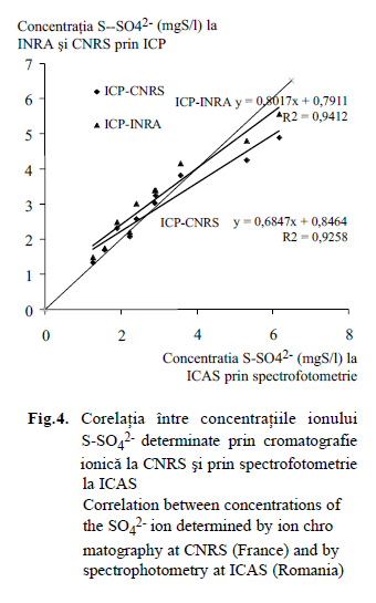 Deoarece laboratoarele INRA şi CNRS au determinat conţinutul în sulf total prezent în probele de precipitaţii prin metoda ICP, în fig. 4 s-a reprezentat corelaţia dintre concentraţiile în ioni S-SO42- obţinute prin cro- matografie ionică la CNRS şi, respectiv spectrofotometrie la ICAS.