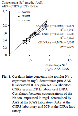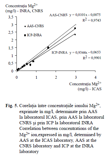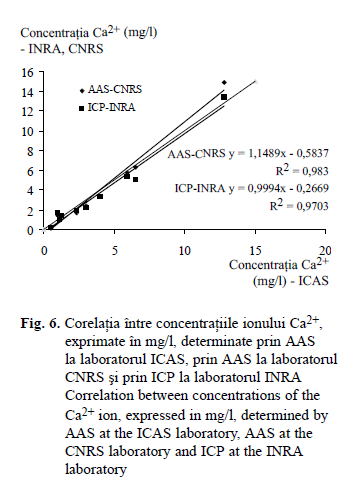 Analizând datele prezentate în tabelul 5 şi în fig. 5, se constată o tendinţă de supraes- timare a rezultatelor obţinute în laboratorul ICAS în comparaţie cu cele două laboratoare franceze, mai accentuată în raport cu laboratorul CNRS care a utilizat aceeaşi metodă de determinare (spectrofotometria cu absorbţie atomică – AAS). Rezultatele laboratorului ICAS sunt mai bine corelate cu cele obţinute la laboratorul INRA prin spectrofotometrie ICP, deşi se constată şi în acest caz tendinţa de supraestimare.