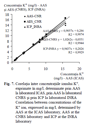 Dintre toţi ionii analizaţi, cele mai bune rezultate s-au obţinute pentru ionul potasiu, abaterile încadrându-se în domeniul ± 15 %, raportat la cele două laboratoare şi cele trei metode folosite, după cum se constată analizând datele din tabelul 7. Cel mai ridicat coeficient de corelaţie (fig. 7) s-a obţinut între rezultatele laboratorului ICAS (prin metoda AAS) şi laboratorul INRA (prin metoda ICP). Foarte bine corelate sunt şi rezultatele obţinute prin spectrofotometrie absorbţie atomică (AAS) la ICAS cu cele obţinute prin spectrofotometrie cu emisie atomică (AES) la CNRS.