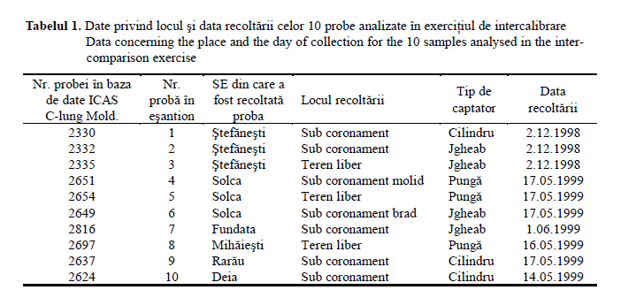 Cele 1 0 probe analizate în prezentul exerciţiu de intercalibrare au fost probe de precipitaţii neconservate, colectate din teren liber şi de sub coronamentul pădurii din suprafeţele de monitoring – nivel II, instalate în România. În tabelul 1 sunt prezentate suprafeţele, locul şi data recoltării probelor.