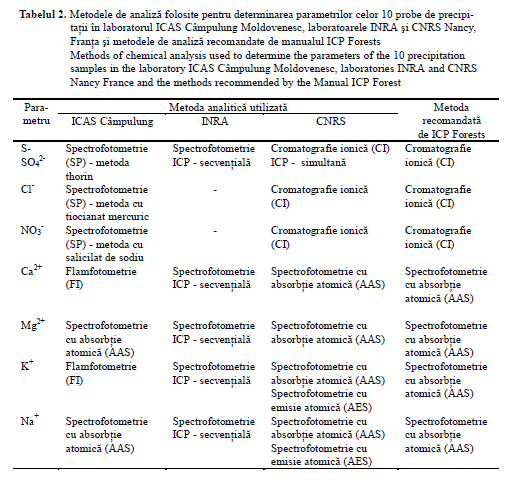 Parametrii fizico-chimici analizaţi pentru probele de precipitaţii colectate din teren liber şi de sub coronamentul arborilor includ de obicei conductivitatea, pH-ul, alcalinitatea (pentru probele cu pH>5), SO42-, NO3-, NH4+, Na+, Cl-, Mg2+, Ca2+, K+ şi Ntotal. Laboratoarele trebuie să utilizeze metode de recoltare, de transport, de tratare şi analizare a probelor conforme standardelor europene. Se recomandă analiza periodică a unor probe de referinţă şi repetarea măsurătorilor pentru cel puţin 5 % din totalul probelor analizate (EMEP, 1995). Erorile analitice pentru principalii ioni, determinaţi cu aceeaşi metodă în acelaşi laborator sunt de obicei mai mici de 5 % (Diederen, 1988, citat de Draijers, 1996). Repetabilitatea rezultatelor este mai redusă în cazul apropierii valorilor parametrilor de limita de detecţie a echipamentului utilizat. În acest caz, erorile pot ajunge până la 20 % (Dierden, 1988, citat de Draijers et al.,1996; Draaijers, 1993).