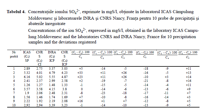 Pentru ionul SO42-, cu o singură excepţie, s-au înregistrat abateri ale rezultatelor obţinute la ICAS cuprinse în intervalul ±20 % pentru concentraţii mai mici de 3,5 mg S-SO42-/l, indiferent de metoda utilizată de laboratoarele franceze. La concentraţii mai ridicate decât această valoare s-a constatat o tendinţă de supraestimare, datorată diluării probelor în laboratorul ICAS.