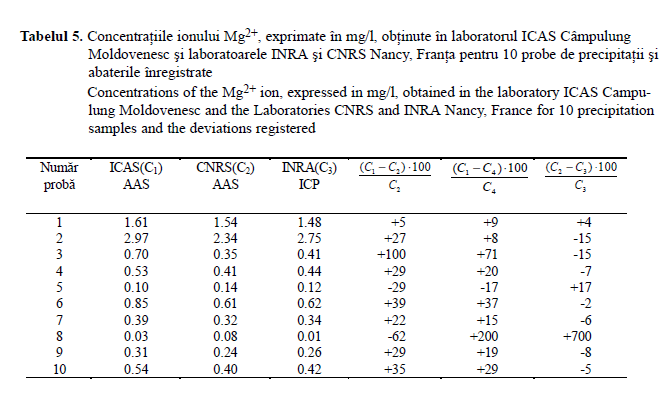 Rezultatele obţinute de laboratorul ICAS în cadrul Proiectului AQUACON au pus în evidenţă abateri pozitive şi negative faţă de laboratorul de referinţă, situate în domeniul ± 20 %, pentru concentraţii peste 0,11 mg Mg/l, deci nu poate fi vorba de o supraesti- mare sistematică a acestui ion.