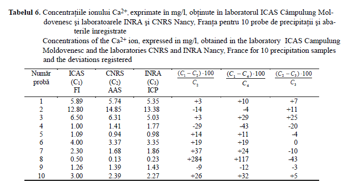 Pentru ionul Ca2+ , abaterile rezultatelor obţinute la ICAS se situează în intervalul ±20 % faţă de cele determinate la CNRS prin AAS, pentru concentraţii mai mari de 3 mg/l. Pentru concentraţii mai mici, abaterile cresc odată cu apropierea de limita de detecţie (1 mg Ca/l).
