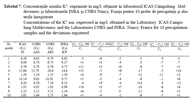Concentraţiile ionului K deşi au acoperit un domeniu larg, au fost foarte bine corelate cu cele obţinute în laboratoarele franceze, iar abaterile rezultatelor obţinutela ICAS raportate la cele de la INRA şi CNRS nu au depăşit 15 %, indiferent de metoda analitică utilizată.