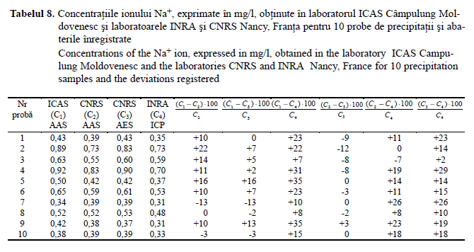La determinarea conţinutului în ioni Na+, cea mai bună corelaţie s-a obţinut între rezultatele laboratorului ICAS, determinate prin spectrofotometrie cu absorbţie atomică (AAS) şi cele ale laboratorului CNRS, determinate prin spectrofotometrie cu emisie atomică (AES), ambele metode fiind recomandate de Manualul ICP Forests pentru determinarea acestui ion. Abaterile înregistrate în acest caz nu au depăşit 16 %.