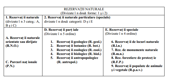 În ceea ce priveşte nomenclatura sistematică consacrată obiectivelor de protecţie a naturii, aceasta se reflectă, în mod evident, în lucrările lui Al. Borza (1924, 1929; 1943) şi ale lui E. Racoviţă (1934), care se aseamănă foarte mult cu aceea a lui E. Bourdelle şi completată la zi de prof. M. Pavan (1973, 1980, 1981).