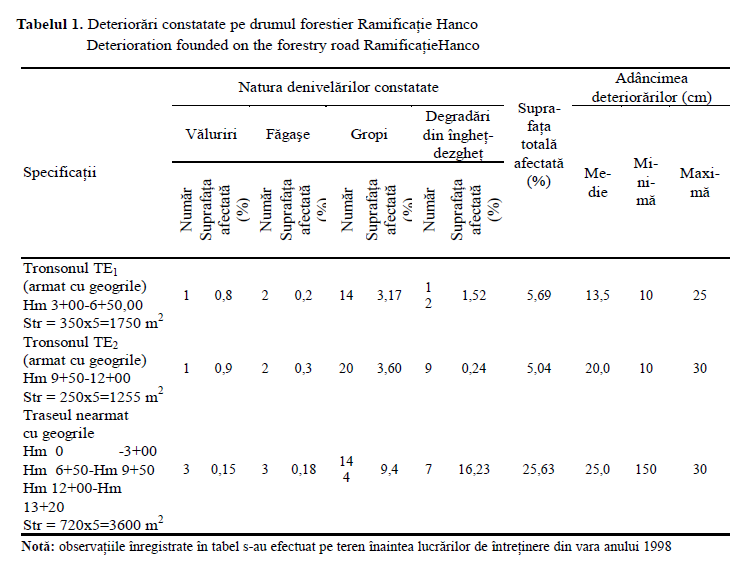 Astfel, dacă în cazul tronsoanelor nearmate cu geogrile suprafaţa afectată de dete-riorări (văluriri, făgaşe, gropi) a reprezentat 25-26 %, pe tronsoanele experimentale, armate cu geogrilă, suprafaţa deteriorată s-a menţinut la 5-6 %. În ceea ce priveşte adâncimea deteriorărilor, şi aici s-au constatat valori medii mai mari cu 25-100 % pe tronsoanele nearmate faţă de tronsoanele armate cu geogrile. Cele expuse mai sus justifică continuarea experimentărilor, pe noi tronsoane, cu privire la utilizarea geogrilelor pe drumurile forestiere.