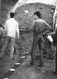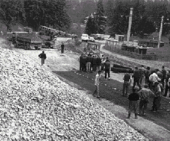 Procesul tehnologic de execuţie a tronsoanelor experimentale a respectat succesiunea logică a operaţiilor, aşternerea geogrilelor pe patul căii, pregătit în prealabil, făcându-se prin derularea rolelor în lungul drumului şi asigurându-se suprapunerea lor pe o lăţime de 20 cm. Descărcarea balastului peste geogrilă s-a realizat astfel încât basculanta să nu calce geogrila întinsă şi încă neacoperită cu balast (fig. 3). În rest, tehnologia de execuţie a fost cea clasică.