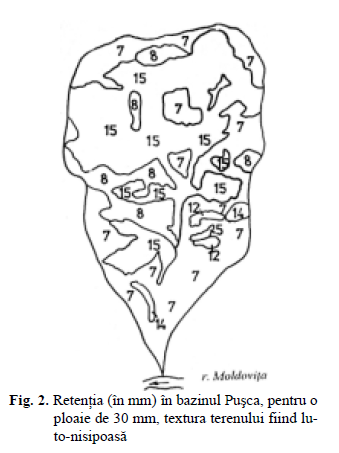 În cazul retenţiei, aceasta poate fi la nivelul coronamentului arborilor (intercepţia), fiind dependentă efectiv de specie, vârstă, indice de acoperire, aparatul foliar, cantitatea de precipitaţii, vânt, temperatura aerului. Din studiile întocmite la noi în ţară rezultă că în zonele montane înalte, bogate în precipitaţii, răşinoasele asigură o bună intercepţie, ceea ce conduce la atenuarea debitelor maxime. Acelaşi lucru este valabil şi la altitudini ceva mai mici, unde predomină amestecurile de fag şi răşinoase. Retenţia se poate face şi la nivelul litierei, unde sunt oprite cantităţi variind între 5-30 % din precipitaţiile căzute. Cantitatea reţinută se poate determina din diverse ecuaţii de regresie, având coeficienţi care ţin de structura litierei. Pe ansamblu, retenţia se poate determina pentru un bazin hidrografic funcţie de caracteristicile terenului şi ale vegetaţiei. Există întocmite tabele pentru diferite înălţimi ale precipitaţiilor, diferite categorii de folosinţă ale ternului, pante şi specii de arbori. În figura 2 se prezintă cartarea terenului din punctul de vedere al retenţiei (în mm) pentru cazul bazinului pârâului Puşca (afluent al Moldoviţei pe partea dreaptă), în cazul unei ploi de 30 mm. În cuprinsul bazinului textura terenului este luto-nisipoasă.