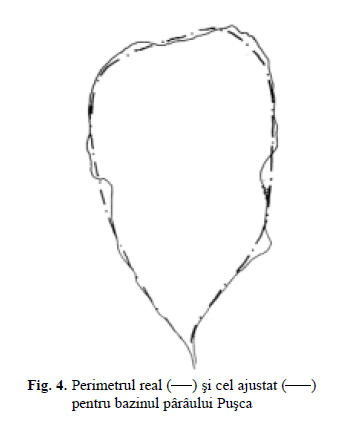 Conturarea este importantă pentru că scoate în evidenţă bazinele mici, care altfel nu puteau fi delimitate. O conturare cât mai îngrijită face ca mărimea suprafeţei (parametru principal la calculul debitului cu diferite asigurări) să fie determinată cu acurateţe cât mai mare. Imaginea bazinului, având cumpăna apelor bine evidenţiată în modelul stereoscopic, permite trasarea şi apoi stilizarea liniei perimetrului în condiţii mai bune decât se poate realiza pe hărţi. Pentru cazul bazinului Puşca, s-a obţinut o diferenţă de lungime de circa 5 % faţă de perimetru real; efectul acesteia asupra determinării lungimii calculate este de circa 9 % (fig. 4).
