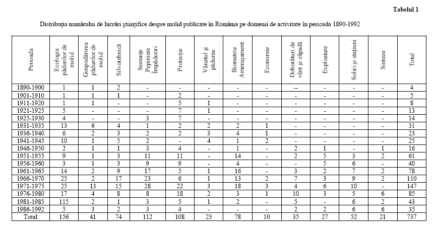 Analizând frecvenţa lucrărilor ştiinţifice publicate pe domenii (tabelul 1), se constată o distribuţie relativ inegală ca număr, dar care validează importanţa unor domenii prioritare ale ştiinţei şi practicii silvice, în strânsă concordanţă cu problematica de moment şi de perspectivă a economiei forestiere. Dintre aceste domenii se pot exemplifica Biometria şi Amenajamentul (Armăşescu, S., Dissescu, R., Giurgiu, V., Ichim, R., Popescu I. Zeletin, I., Toma, G.), Silvotehnica (Ciobanu, P., Gava, M., Petrescu, L., Vlad, I.), Tipologia pădurilor, solurilor şi staţiunilor (Chiriţă, C. D., Georgescu, C. C., Leandru, V., Paşcovschi, S., Păunescu, C., Stănescu, V.), Pepiniere – Împăduriri – Ameliorare (Lăzărescu, C., Morar, Gh., Niţu, C., Vlase, I) Protecţia pădurilor (Ceianu, I., Eliescu Gr., Georgescu., C. C., Ene, M., Simionescu, A., Mihalciuc, V., etc.