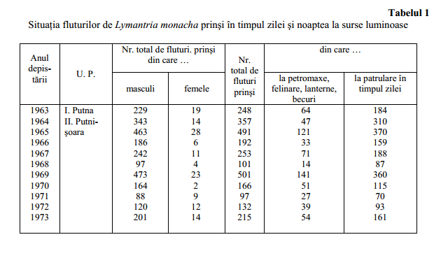 În perioada 1963-1993, întregul personal silvic (pădurari, brigadieri, tehnicieni şi ingineri) a fost anternat în depistarea defoliatorului în stadiul de fluture, prin metodele cunoscute pe atunci, de observare a fluturilor pe trunchiul arborilor în timpul zilei şi la surse luminoase, pe timp de noapte.