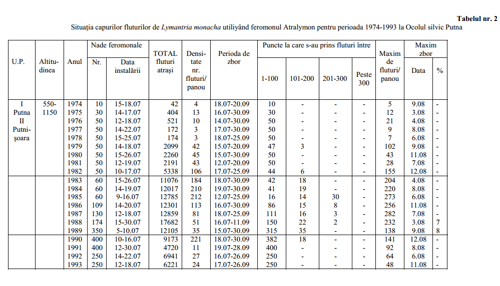 Cunoscut ca un periculos dăunător al pădurilor de molid, Lymantria monacha a fost depistată în Ocolul silvic Putna în anul 1963 (U.P. II Putnişoara, u.a. 104 A) în stadiul de fluture, pe trunchiul arborilor. De atunci şi până în prezent, deci în decurs de 30 de ani, s-au aplicat diferite metode de depistare, care au permis elaborarea unor concluzii utile pentru practică.
