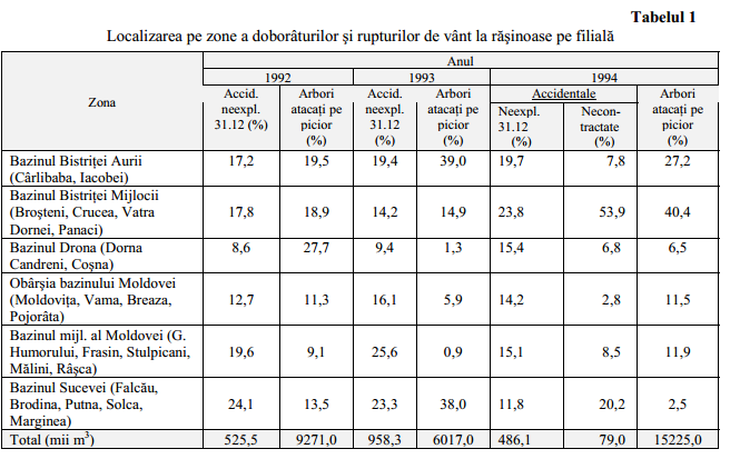 Doborâturi mai multe au fost atât în bazinul Bistriţei, cât şi a Moldovei şi Sucevei (tabelul 1), la ocoalele silvice Cârlibaba, Crucea, Panaci, Dorna Candreni, Iacobeni, Stulpicani etc. Aşa cum rezultă din tabelul 1, în majoritate volumul doborâturilor s-a produs în bazinul superior al Bistriţei, inclusiv al Dornei, fiind în procent de 35% în 1993, pentru ca în 1994 să ajungă la peste 60%.