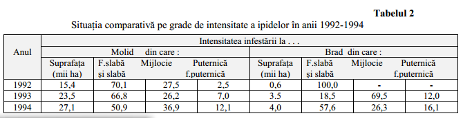 Situaţia în ultimii ani este şi mai accentuată datorită faptului că, prin reglementările în vigoare, rămân multe parchete necontractate la timp, care în schimb sunt sursă excelentă de înmulţire a insectelor. In acest fel ipidele, din dăunători secundari ajung dăunători primari, capabili să atace arborii sănătoşi din zonă. Aşa se explică creşterea suprafeţeleor pe care s-au depistat gândaci de scoarţă la răşinoase de la 16 mii ha în 1992 la 27 mii ha în 1993 şi 31 mii ha în 1994. Pe grade de intensitate (tabelul 2) se remarcă creşterea de la an la an a suprafeţelor cu intensitate puternică şi foarte puternică, ceea ce reflectă accentuarea dezvoltării populaţiilor de insecte.