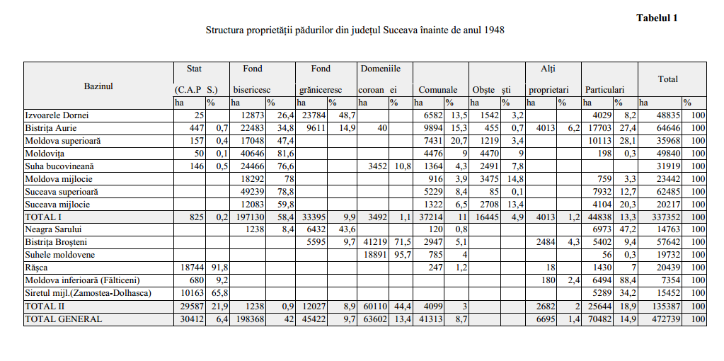 In tabelul 1 sunt redate, pe bazine hidrografice, categoriile de proprietari existente în 1948 pe teritoriul actualului judeţ, cu suprafeţele ce le deţineau, grupate în două părţi : prima parte cu cele 8 bazine se referă la Bucovina, care însuma 337.352 ha, respectiv 71,4 %, iar partea a doua alcătuită din alte 6 bazine, însumând 135.387 ha, respectiv 28,6 %, reprezenta porţiuni din nordul Moldovei cuprinse în suprafaţa judeţului Suceava. Din totalul de 472.793 ha identificat potrivit legii 204/1947, „pentru apărarea patrimoniului forestier”, suprafaţa păduroasă însuma aproximativ 416 mii ha, ceea ce reprezenta 88 %, restul fiind goluri, terenuri neproductive şi suprafeţe neregenerate.