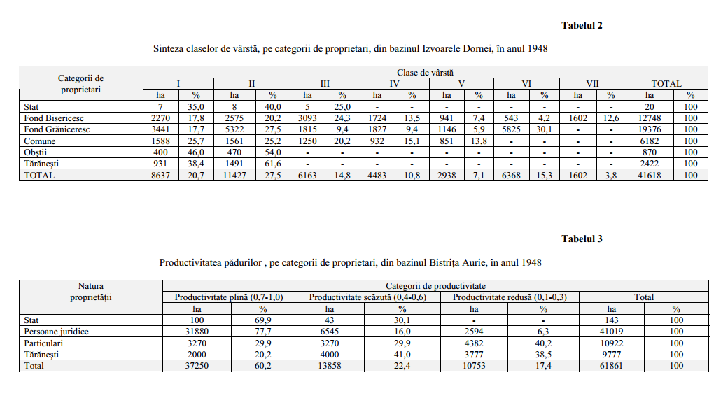 La data naţionalizării în aceste păduri se găseau suprafeţe mai neregenerate, clase de regenerare reprezentând peste 18 %, iar arboretele primelor trei clase de vârstă depăşeau 70 % din total (tabelul 2). Numai excepţional au fost unele păduri mai bine gospodărite, spre exemplu pădurea comunei Câmpulung Moldovenesc (Colbu) şi pădurea comunei Borşa (Bârjava).