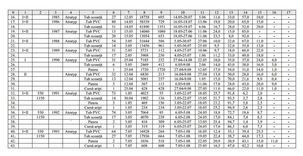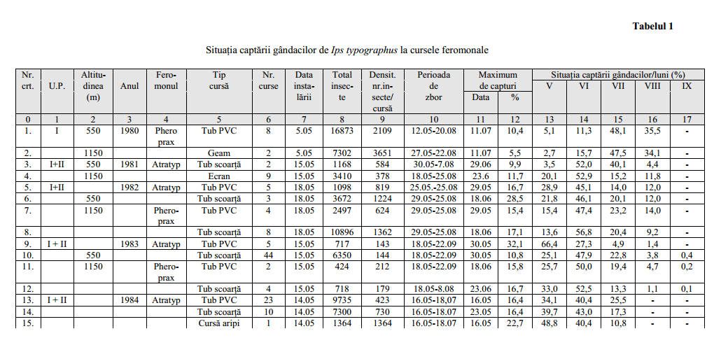 Pentru culegerea datelor au fost instruiţi şefii de cantoane (pădurarii) care, au operat la timpul stabilit evidenţele respective. Feromonii au fost fixaţi în toate tipurile de curse, capturându-se un număr însemnat de gândaci care sunt prezentaţi în tabelul 1. Densitatea cea mai mare de insecte captate la cursă, s-a realizat la tipul cursă panou şi cursă cu aripi.